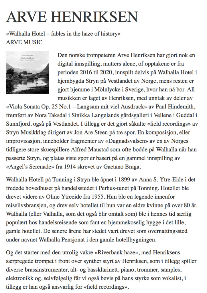 Arve Henriksen Walhalla Hotel – Fables in the Haze of History arvemusic/arvemusic.com