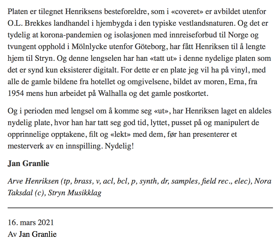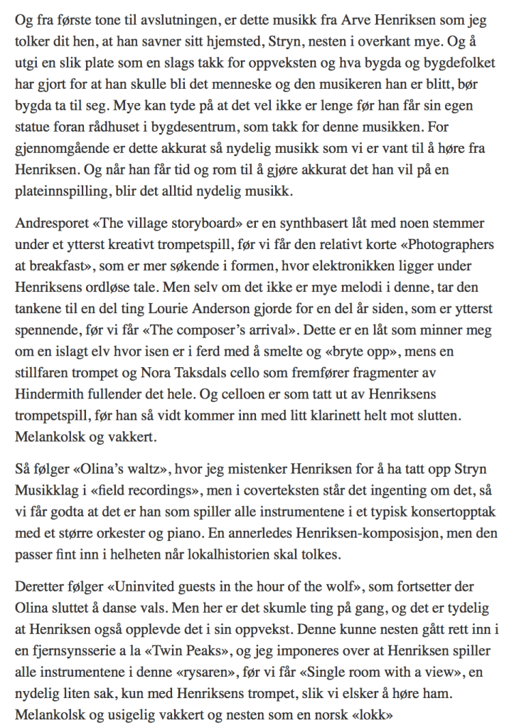 Utstyrt med ymse trompeter og andre blåseinstrumenter, si unike stemme, tangentinstrumenter, trommer, sampling, elektronikk og feltopptak frå Stryn, har Henriksen i perioden 2016 til 2020 satt sammen melodier, lydlandskap og stemninger som tar oss med inn i dette flotte huset. Ingen andre, absolutt ingen andre, kunne ha gjort dette og disse historiske fablene er med på å understreke hvilken unik artist Henriksen er.