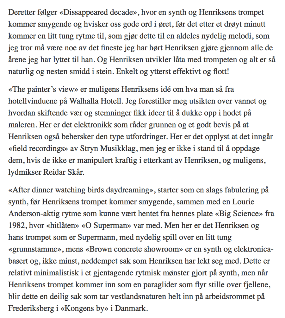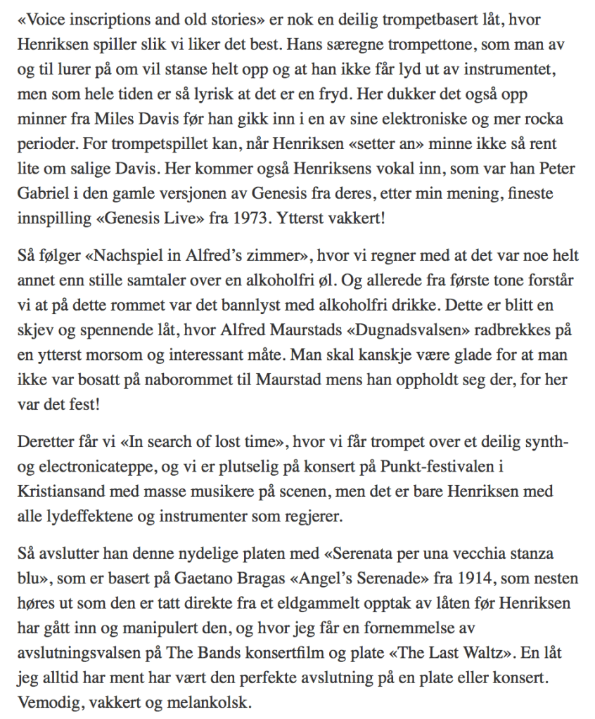 Henriksen har jobba med dette prosjektet i flere år og det har blitt et praktverk. Vi møter sjefen på en rekke instrumenter i tillegg til trompeten. I tillegg har han invitert med seg en rekke gjester på noen av spora, blant andre bass-maestro Anders Jormin, fargeleggermester Eivind Aarset på gitar og fruen Anna Maria Friman på hardingfele.